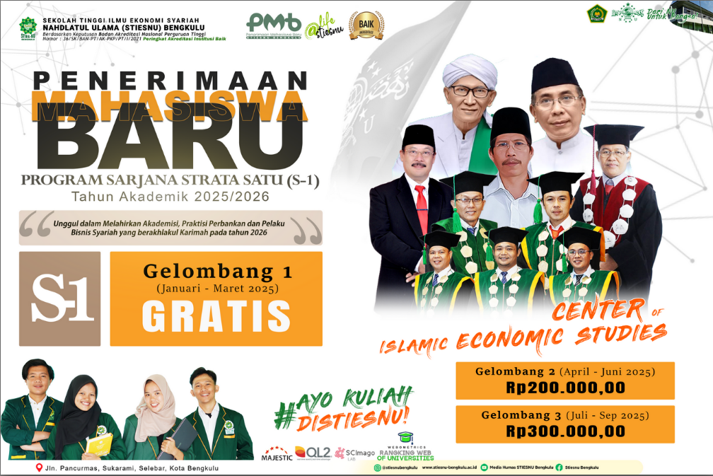 Bengkulu – 30 April 2025 Sekolah Tinggi Ilmu Ekonomi Syari’ah Nahdlatul Ulama (STIESNU) Bengkulu resmi membuka pendaftaran mahasiswa baru gelombang kedua untuk Tahun Akademik 2025/2026. Kesempatan ini diberikan kepada calon mahasiswa yang belum sempat mendaftar pada gelombang pertama, sebagai bagian dari komitmen STIESNU dalam memberikan akses pendidikan tinggi yang berkualitas dan berbasis nilai-nilai keislaman.