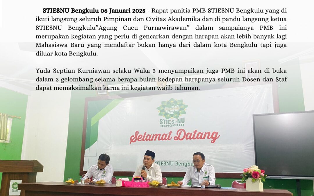 Bengkulu, 6 Januari 2025 – Dalam rangka persiapan Penerimaan Mahasiswa Baru (PMB) Tahun Akademik 2025/2026, Sekolah Tinggi Ilmu Ekonomi Syariah Nahdlatul Ulama (STIESNU) Bengkulu menggelar rapat pembentukan panitia PMB. Kegiatan ini berlangsung di Kampus STIESNU Bengkulu dengan dihadiri oleh Ketua STIESNU Bengkulu, Agung Cucu P., MH., Wakil Ketua I, II, dan III, Dewan Pengurus, serta dosen pengajar.